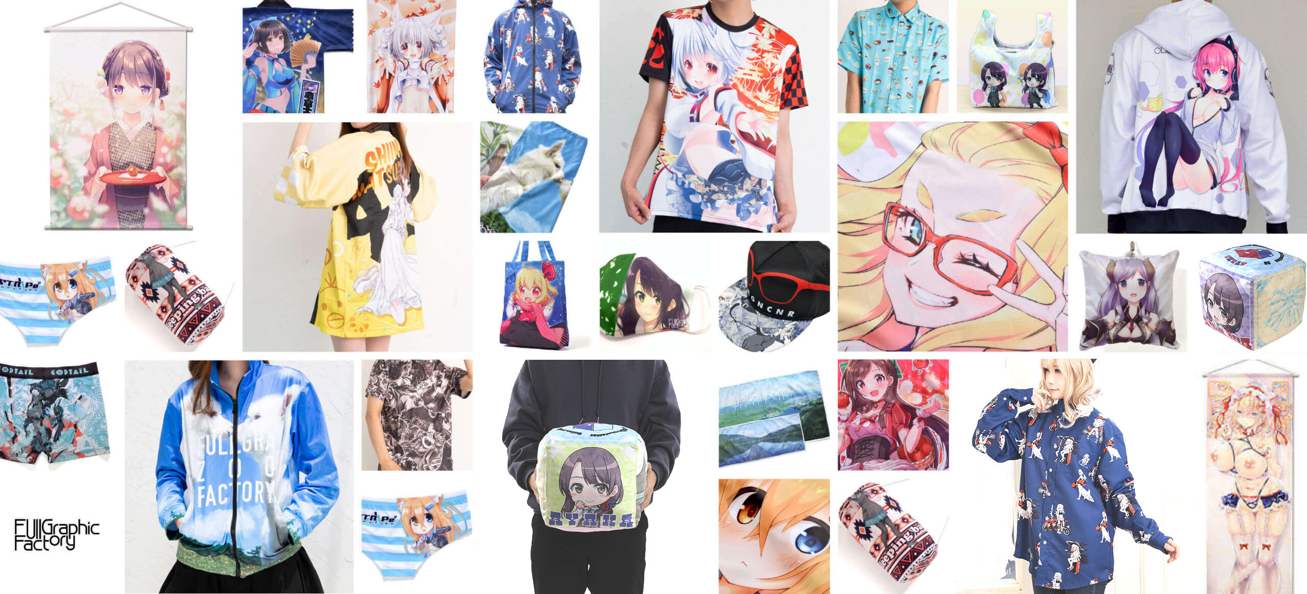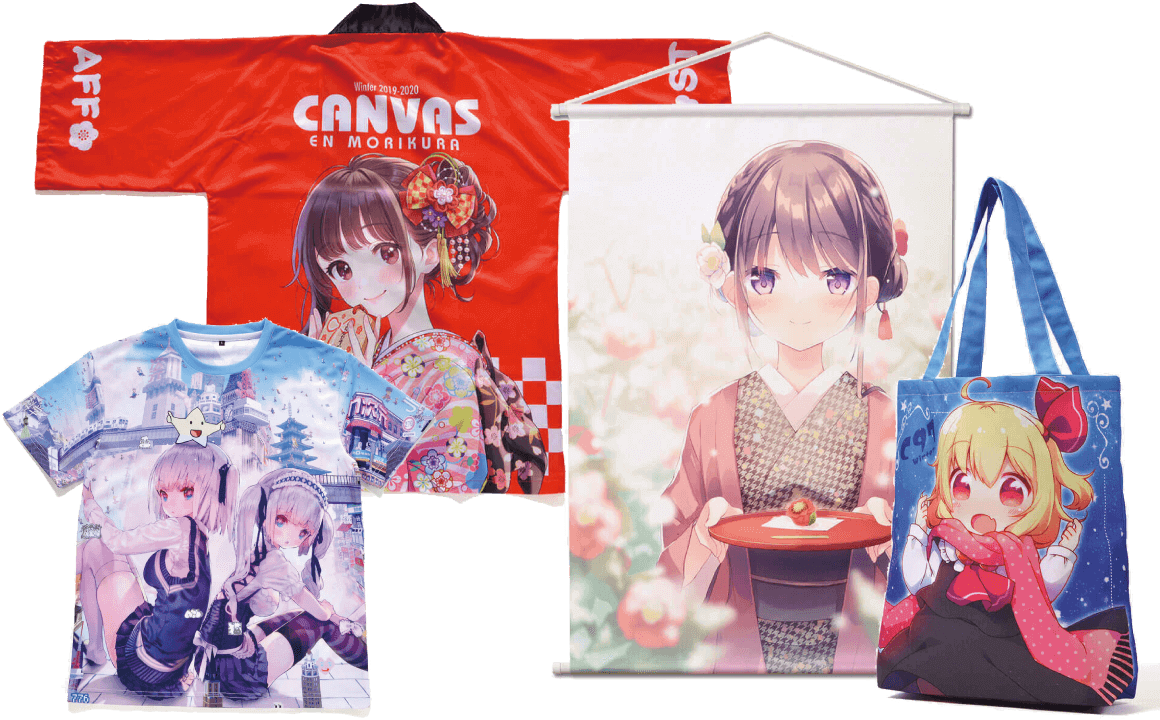 商品一覧 Tシャツ10枚〜 パーカー・スウェット10枚〜 法被10枚〜 カジュアルシャツ10枚〜 アウター10着〜 ハーフパンツ20枚〜 アンダーウェア20枚〜 タペストリー20枚〜 抱き枕・枕カバー10個〜 タオル30枚〜 クッション30個〜 ブランケット30枚〜 バッグ20個〜 ストラップ50個〜 布マスク50枚〜