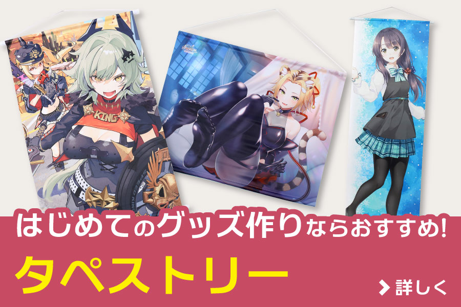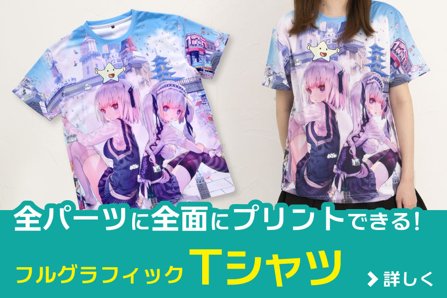 商品一覧 Tシャツ10枚〜 パーカー・スウェット10枚〜 法被10枚〜 カジュアルシャツ10枚〜 アウター10着〜 ハーフパンツ20枚〜 アンダーウェア20枚〜 タペストリー20枚〜 抱き枕・枕カバー10個〜 タオル30枚〜 クッション30個〜 ブランケット30枚〜 バッグ20個〜 ストラップ50個〜 布マスク50枚〜 お役立ち情報 2025年12月1日 同人イベントで気をつけたい!サークル参加者のマナーと注意点を徹底解説 2025年11月20日 一次創作とは?二次創作との違いや活動の始め方を紹介 2025年11月7日 やってきました!コミケ107の当落日 2025年11月4日 同人即売会での値札のデザインや作り方!おすすめのテンプレートも紹介 2025年10月14日 同人即売会とは?楽しむための基礎情報や参加方法を徹底解説 一覧を見る