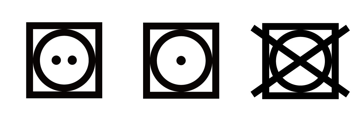 正方形に円が入った記号は乾燥機の仕様についてのマークです。円の中に黒丸1つが60℃までの乾燥機が使えます。黒丸2つで80℃までの乾燥機が使えます。✕が付いた場合は乾燥機を使えません。