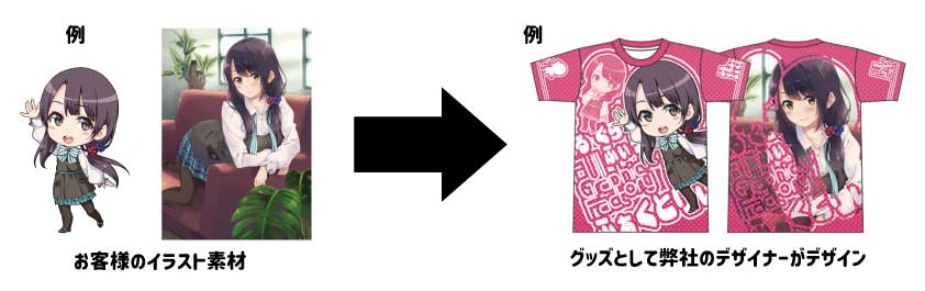お客様のイラストとイメージを基にグッズのデザインを代行いたします。お客様がご満足いただけるデザインになるようにデザインの進行状況もご報告。