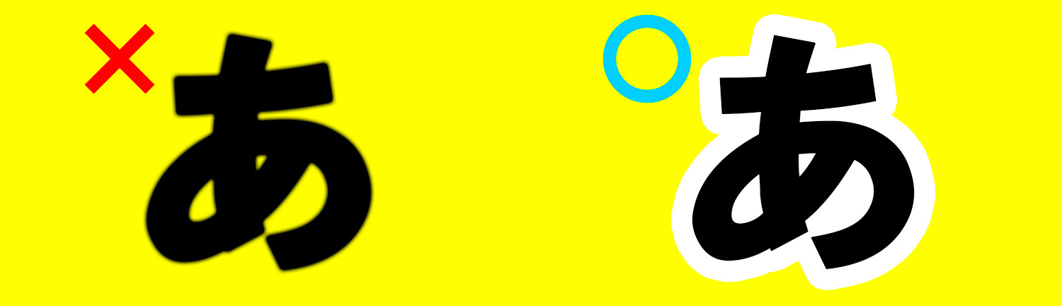 上の図の右の「あ」はゴシック体という太字の黒字の場合、生地の関係上、左の「あ」のように滲んで印刷されてしまうというケースもございます。そんな状況を避けるためにも、字体を細めのゴシック体に変更されるか白縁を付けることで滲みが緩和されます。