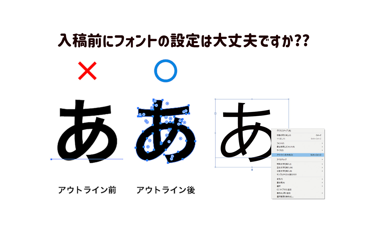 前回では「テンプレートの見方と使い方」を投稿させていただきました。そして今回は「入稿したけど再入稿を求められる!?」ということの内容によくある入稿データ内の不備や後から気づく失念点をお伝えしますネ。まずは、『フォント』に関する設定です!!