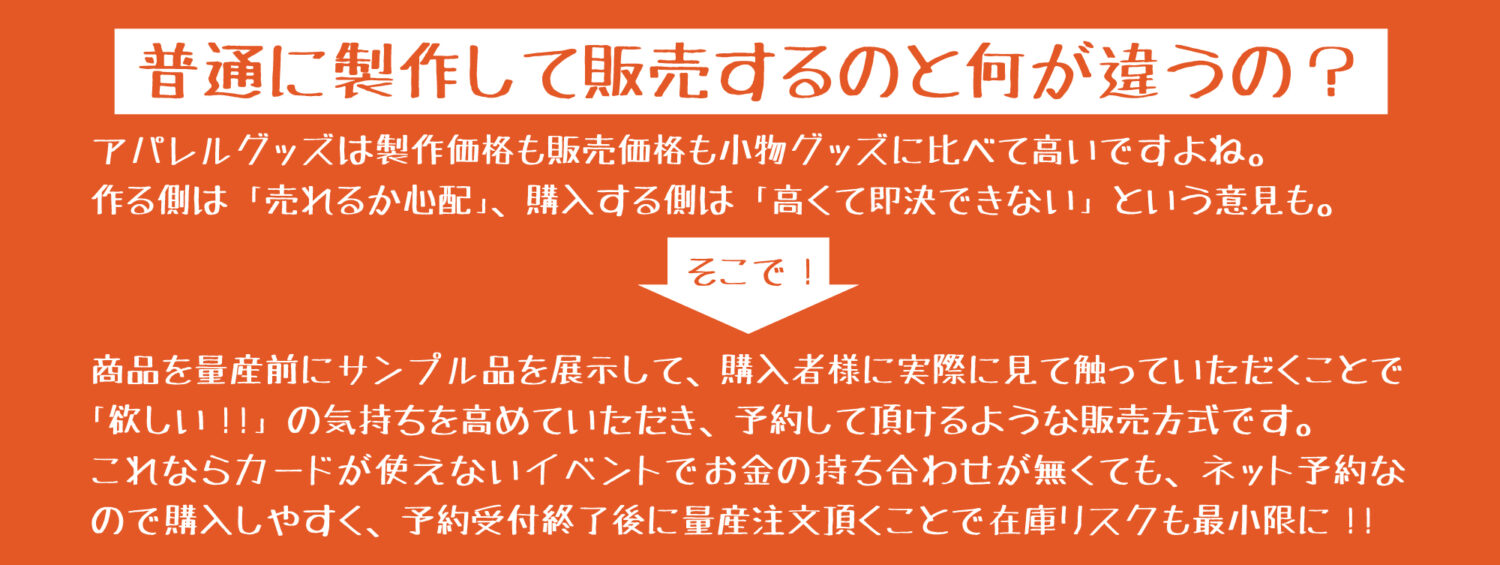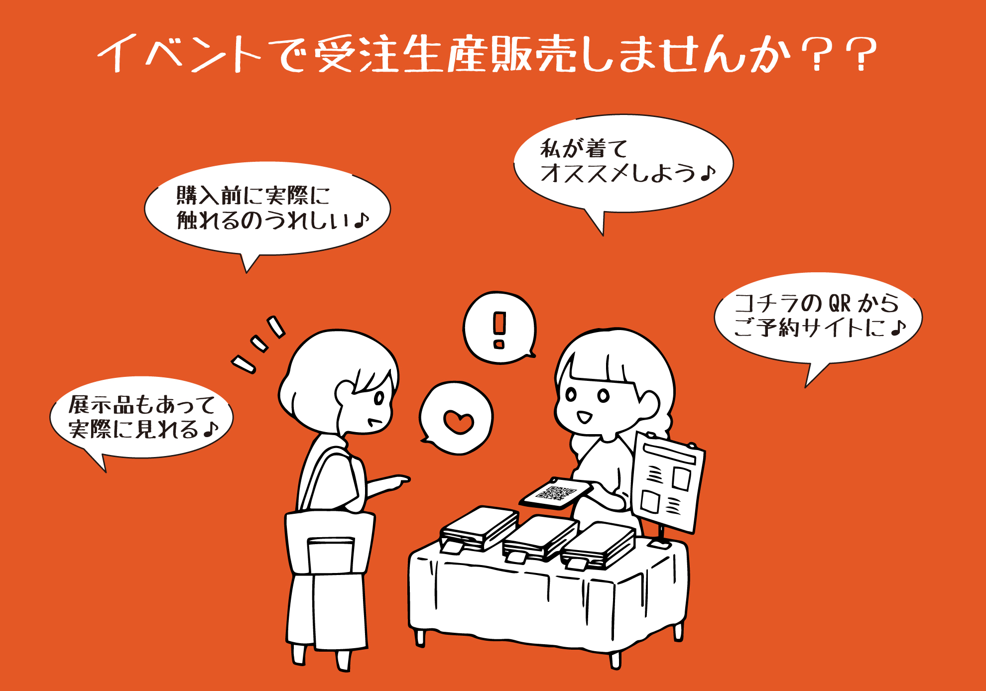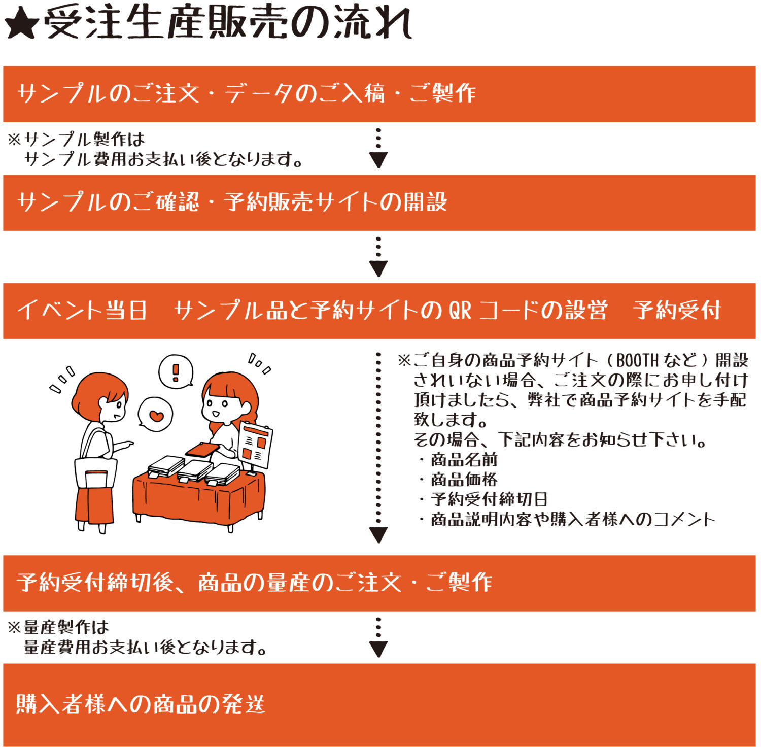 イベント開催前にサンプルをご製作いただき、ご自身の商品販売サイト(BOOTHなど)に商品予約受注を作成しページへ誘導される「QRコード」をイベント当日にご活用いただきこ購入希望者に商品をご予約いただく販売方式です。