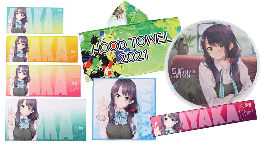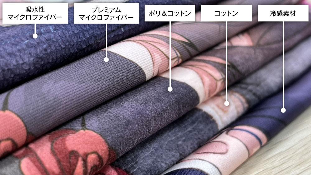 フルカラープリントのタオルが新しくなりました。ポリエステル生地だけでなく、ポリ綿混合生地や綿100%もラインナップしました。特徴のある5種類の生地から用途に合わせて選択でき、自慢の印刷技術で驚くほど美しく、そして安価に制作いただけます。全て生地の端まで印刷することができます。