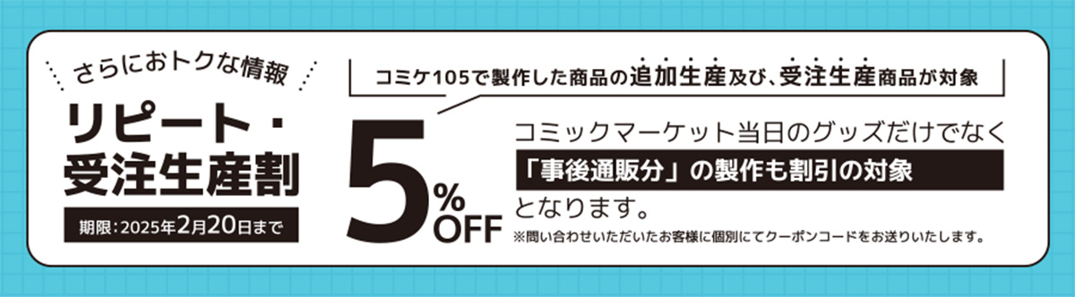 ★コミックマーケット当日のグッズだけでなく事後通販分の製作も割引の対象となります。